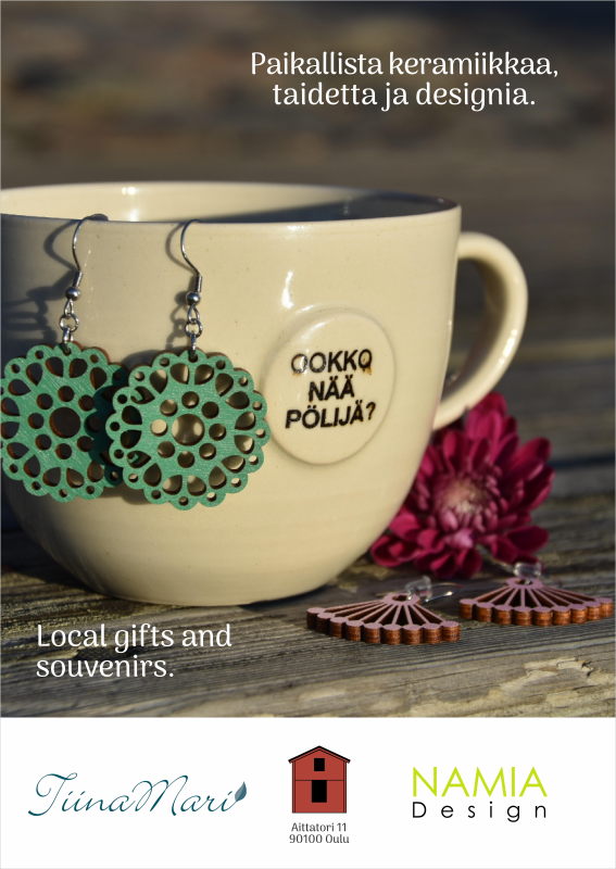 Toriaitta 11 Oulun torilla on avoinna koko kesän, aina elokuun loppuun asti. Tervetuloa ihastumaan paikalliseen käsityöhon! Toriaitalta löydät TiinaMarin keramiikkaa, mm. Oulun murrekupit, amppelit, sammakot ja naamaruukut. Namia Design on suunnitellut mm. hurmaavia vanerikoruja ja tarjottimia.